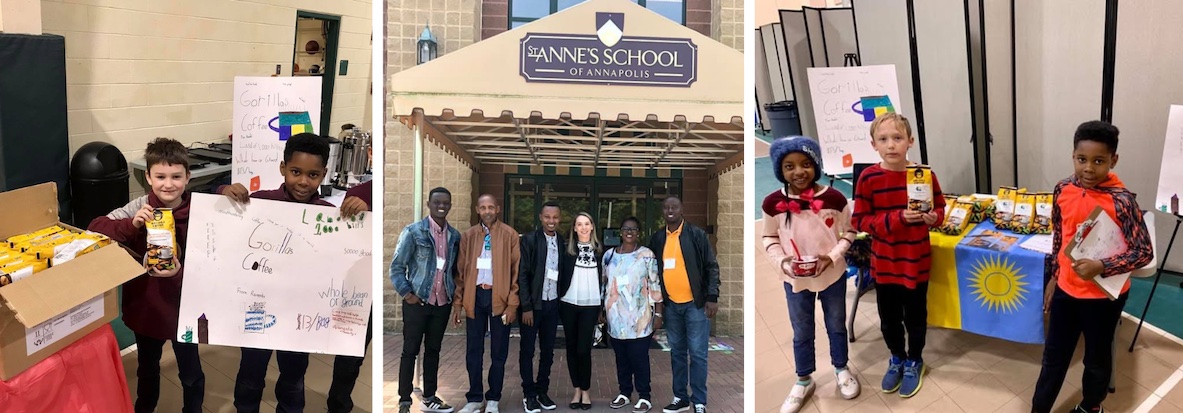 Mrs. Coker welcomes visiting Rwandan teachers to St. Anne’s School in April 2019 (middle). Third Grade students selling Rwandan coffee at the 2018 Holiday Bazaar after learning about the country of Rwanda and connecting with APACOPE students via video conferencing (left and right).