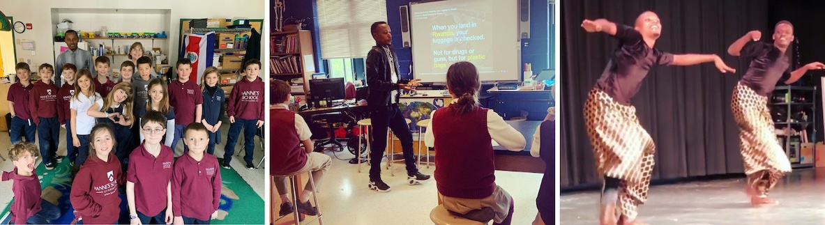 Mr. Muhoza with Third Grade (now Seventh Graders), instructing Eighth Grade Environmental Science, and leading a demonstration on Traditional African Dance in February 2020.